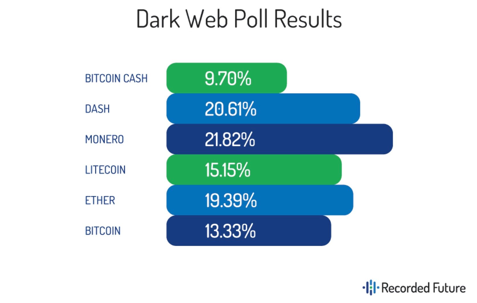 Results of DarkWeb Polls. Source: recordedfuture.comThe investigators at Recorded Future then went on to try and establish which of those coins are beginning to replace Bitcoin as the currency of choice on the Darknet. The results of the poll that they conducted are to the right.