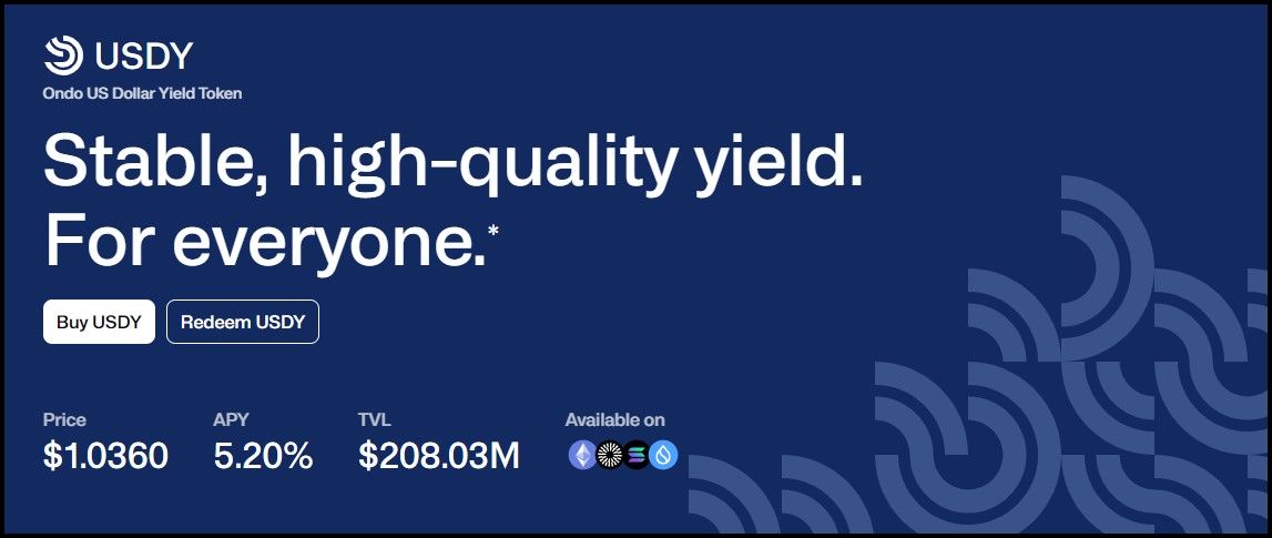 Ondo Finance USDY Product | Image via OndoOndo's approach is built on the belief that blockchain should host a variety of trading activities, not just those seeking dramatic yields. By tokenizing institutional-grade investment products, Ondo Finance enhances financial inclusivity. This tokenization process democratizes access to traditional financial markets, previously the domain of select investor classes typically within specific geographic confines.