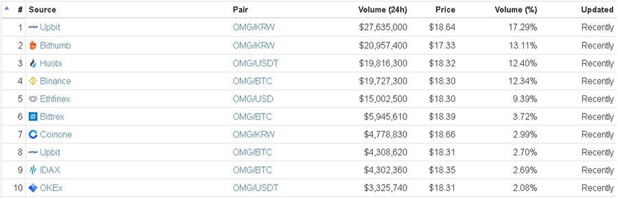 Image source: coinmarketcap.comThese are the top 10 markets for OmiseGo as well as the trading volume on each market. OmiseGo has attracted a lot of interest lately especially in the Asian markets.