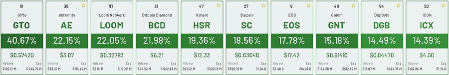 When you couple the momentum of the price of the coin with an increase in volume, the bullish outlook is further cemented. Below is a list of the biggest movers over the last 24 hours.