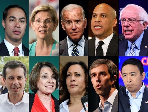 The Democratic Party’s presidential candidates in 2020. Clockwise from top left: Julian Castro, Elizabeth Warren, Joe Biden, Cory Booker, Bernie Sanders, Andrew Yang, Beto O’Rourke, Kamala Harris, Amy Klobuchar, Pete Buttigeg.