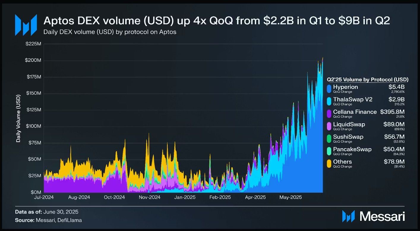 - DEX activity accelerated: Q2 volume hit $9.0B (+310% QoQ) and June alone reached $4.4B. Two venues drove the jump: Hyperion (29× QoQ to $5.4B) and ThalaSwap V2 (4× to $2.9B).