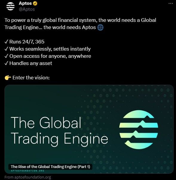 Why the shift? Aptos has been recasting itself as a “Global Trading Engine,” a stack that rethinks everything from consensus to application features so intent turns into settlement with minimal friction. The aim is simple: make on-chain finance feel instant, cheap, and reliable enough for everyday use.