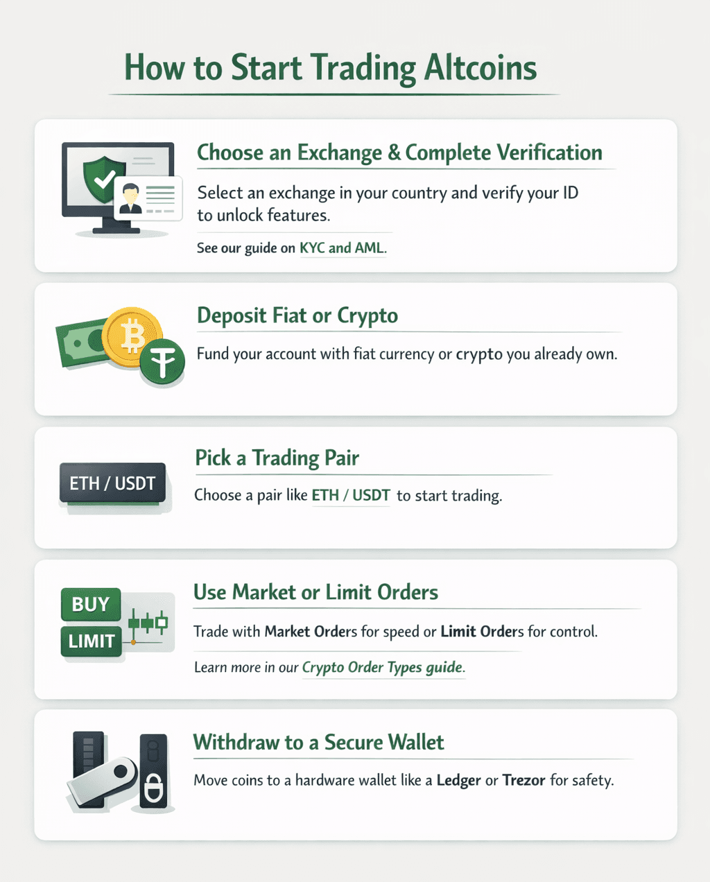 Starting is usually simpler than it looks. Think of it like using a stock app for the first time: you open an account, add money, choose what you want to buy, place an order, and then decide whether to keep it on the platform or move it somewhere safer. The main difference is that crypto adds things like wallets, networks, and trading pairs.