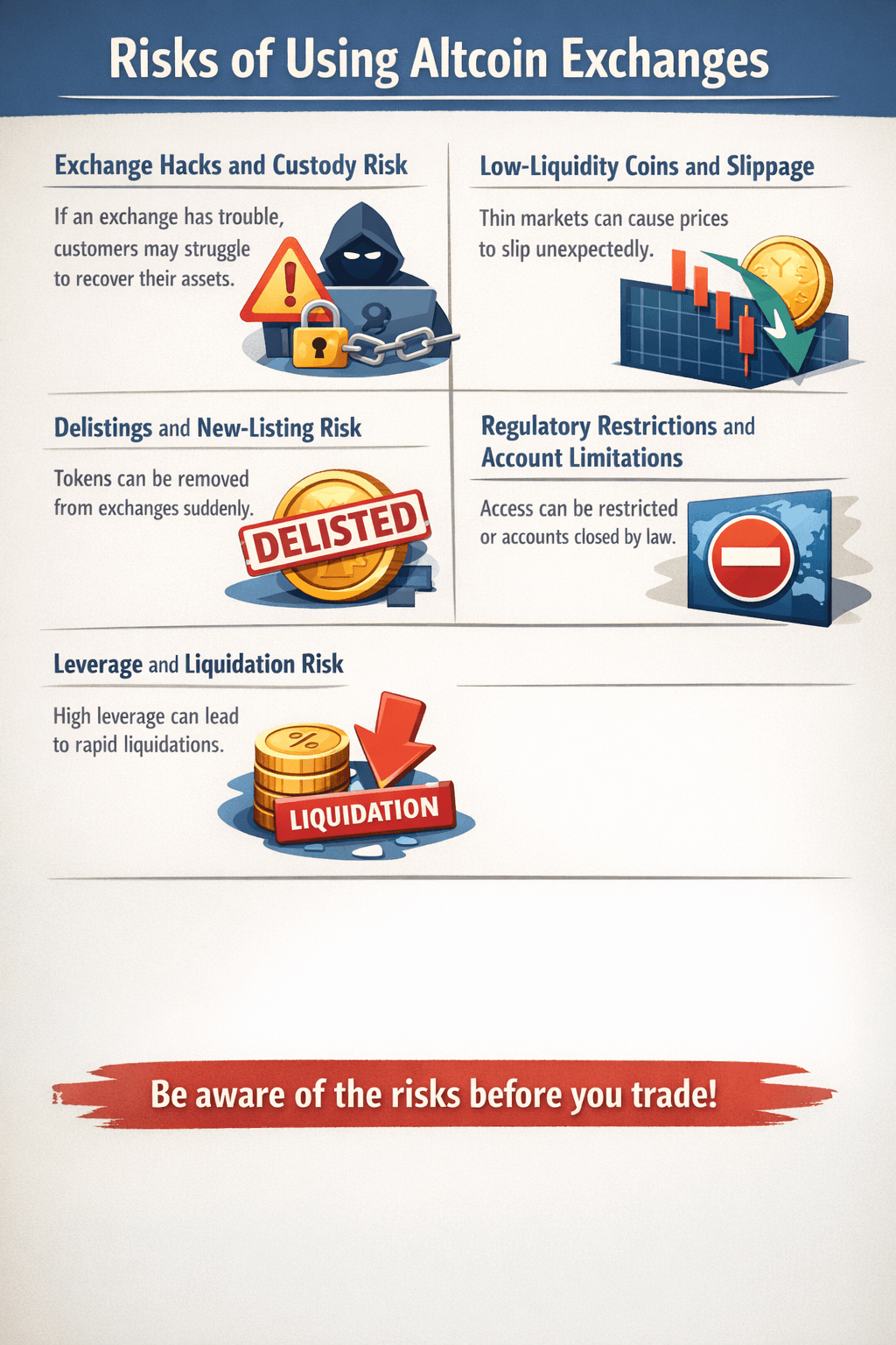 Altcoin exchanges can make trading easier, but convenience comes with trade-offs. The biggest risks are not always dramatic market crashes. Often, they come from how the platform works, how thin a market is, or how much leverage a trader takes on without realizing how quickly things can move.