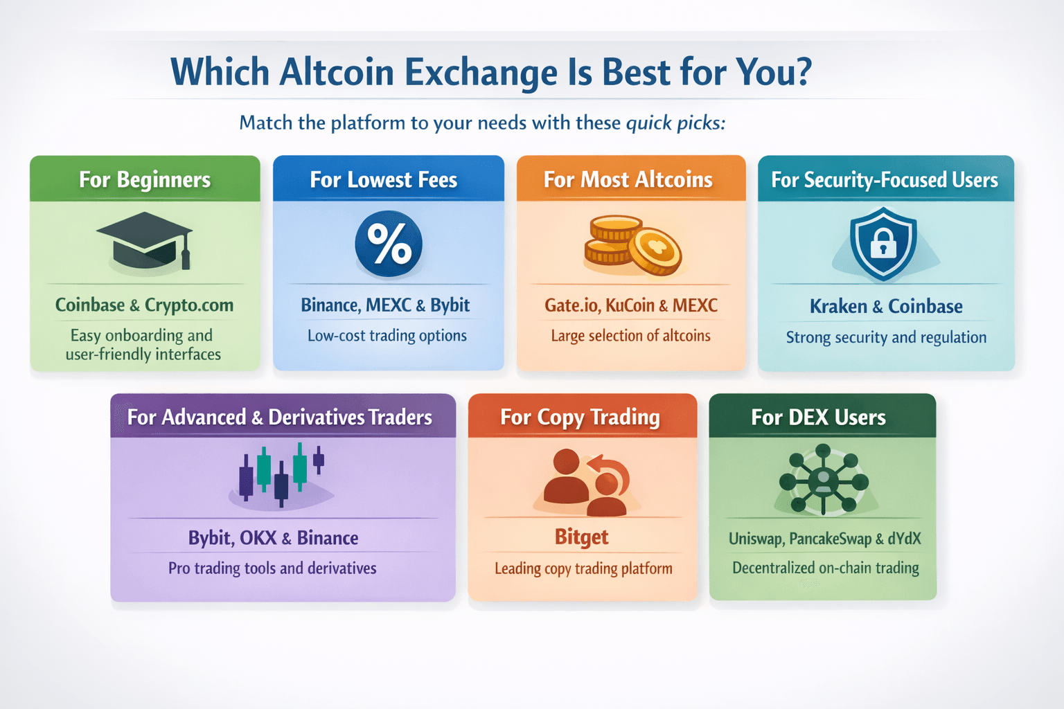 The right altcoin exchange depends less on brand name and more on what you actually need. Some traders want simplicity, others care most about fees, and some need deeper coin coverage or more advanced tools. Here is the quickest way to match the platform to the job.