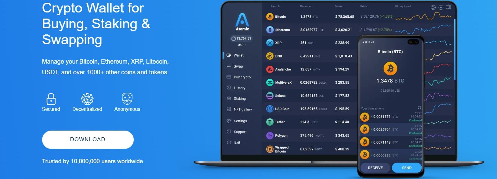 Atomic Wallet is a non-custodial, multi-currency wallet supporting over 1000 cryptocurrencies, including Bitcoin, Ethereum, XRP, and a plethora of ERC-20 tokens. Available on Android, iOS, and desktop platforms, it ensures users have access to their assets wherever they go.