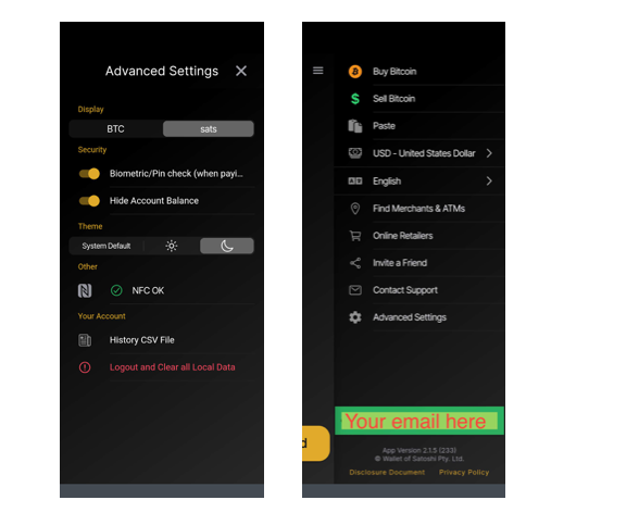 Menu and Setting options. Image via Wallet of SatoshiOverall, the clean and simple interface presents an inviting allure to use the app, giving users the confidence to try it out.