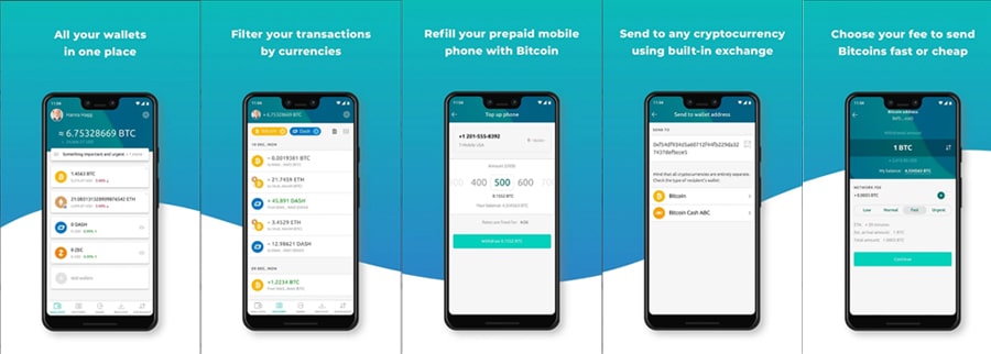 Screenshots of the FreeWallet Mobile App. Image source: Google Play StoreSecurity hasn’t been left out with this wallet either. It includes PIN code verification, two-factor authentication, and even has a fingerprint login. It allows you to set spending limits, which is a way to stop potential thieves from transferring away all your funds. And it also supports multi-sig.