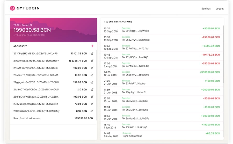 The Bytecoin Web Wallet User InterfaceJust remember that web wallets are not as secure as desktop wallet, and Bytecoin’s web wallet also stores private keys and funds on a central server. This leaves it far more susceptible to hacking attempts.