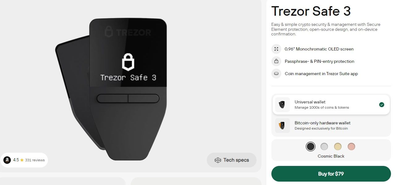 The Trezor Safe 3 is a simple yet secure hardware wallet that caters to both beginners and experienced users. With support for thousands of cryptocurrencies and strong security features, it offers an affordable way to safely store digital assets.