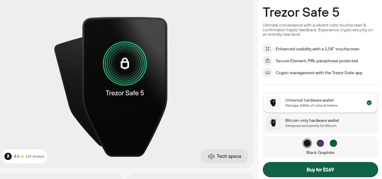 | Trezor Safe 5 | $169 | 1.54” Color touchscreen, Haptic feedback, EAL6+ Secure Element | Secure, User-friendly screen | Pricey, Learning curve with Trezor Suite |