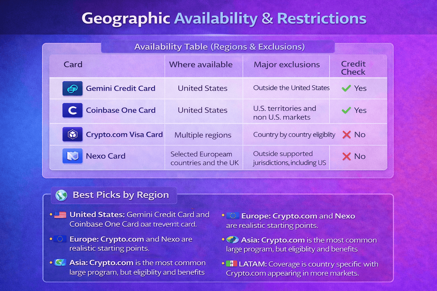 Even the strongest rewards card is a non starter if it is not offered where you live. Crypto cards are especially sensitive to local licensing, banking partners, and compliance rules, so availability should be the first filter before comparing perks.