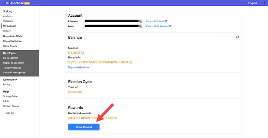 The next step is to delegate your LOOM tokens to a validator. The validators keep a portion (as much as 25%) of the staking rewards. Rewards will accumulate in the Basechain Wallet, and users must manually collect those rewards occasionally.