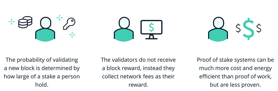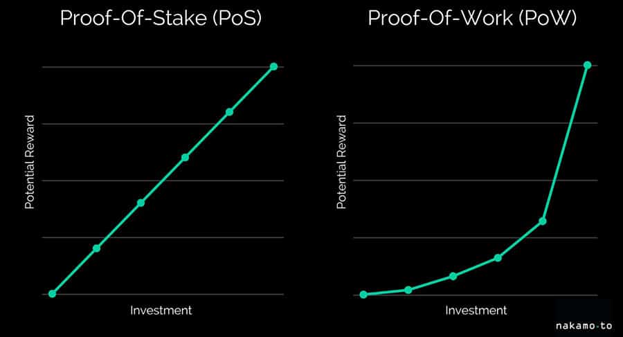 Proof-of-Work vs Proof-of-Stake. Image via BlockGeeksProof-of-work (PoW) and proof-of-stake (PoS) systems vastly differ in creating cryptocurrencies and incentivising and rewarding individuals. For example, proof-of-work (PoW) blockchains like Bitcoin reward their miners with newly created cryptocurrency as part of the mining process. For example, Bitcoin Miners receive Bitcoin (BTC) as rewards.
