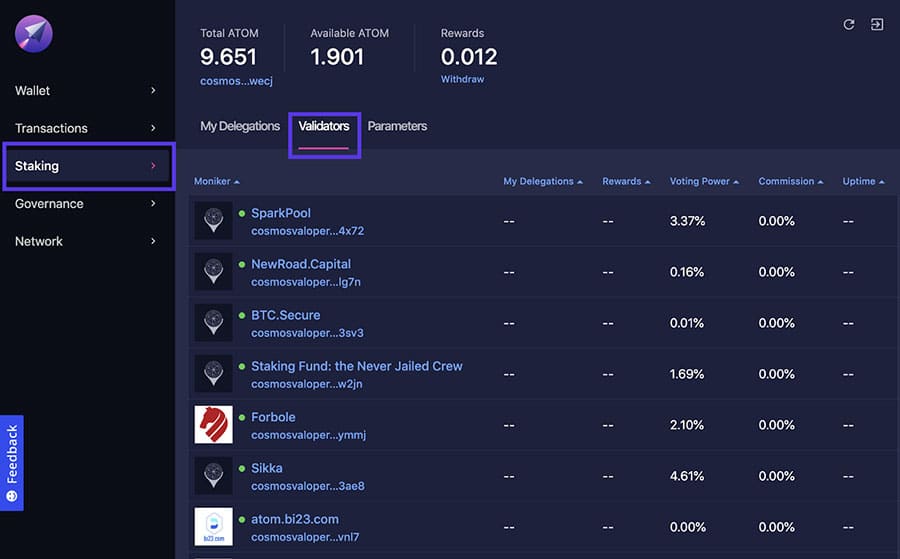 Choosing Delegators on the Lunie Wallet for ATOM. Image via MediumStaking rewards at the time of writing are 8.2% annually but can go as high as 20% if the proportion of ATOM staked falls below two-thirds of the total supply. Staking is as easy as holding ATOM in a supported wallet and then choosing a validator to delegate to. It is also necessary to periodically claim rewards manually.