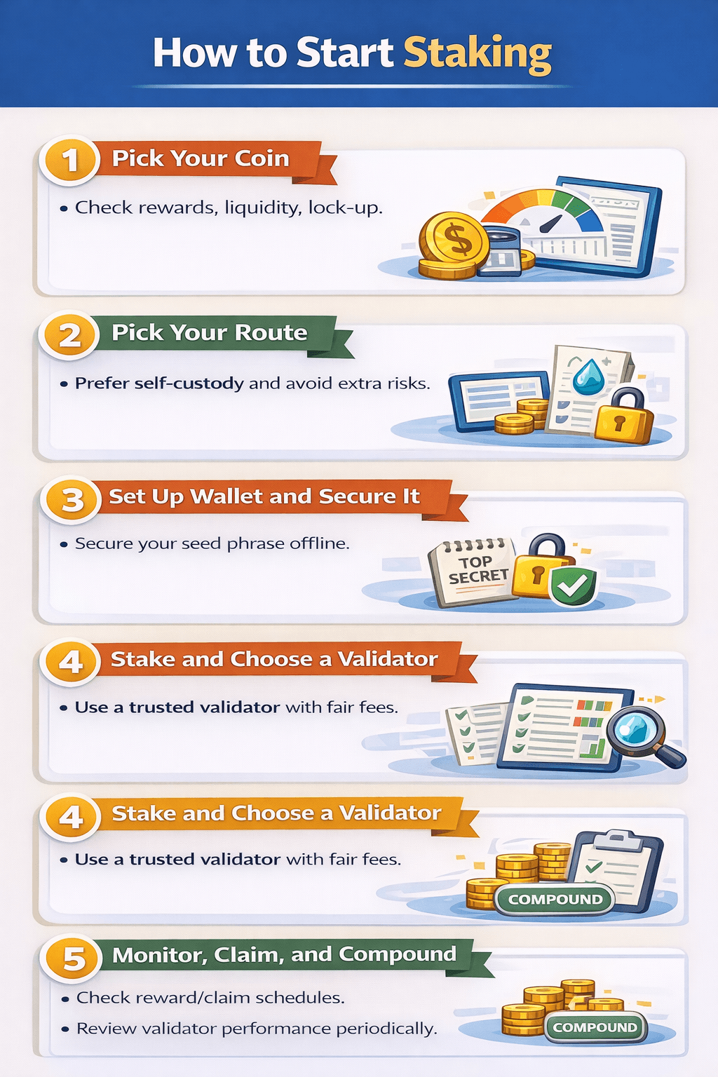 Exchange staking: The platform stakes for you; simplest UX but custodial and regulatory exposure.
