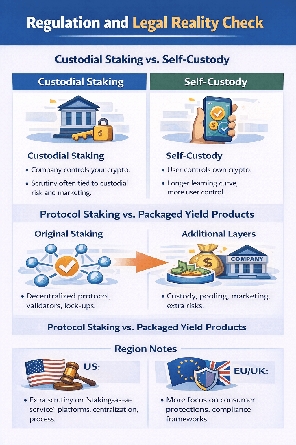 Why staking-as-a-service gets scrutiny: When a company takes custody of customer crypto and offers a “staking yield,” regulators may view it more like a packaged financial product than a simple network feature. In the US, the SEC’s Kraken staking-as-a-service settlement highlights concerns around how these programs are offered and described to investors.