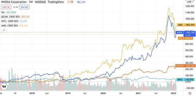 Here's a look at the performance's of these stocks. As you can see Nvidia and AMD have outperformed Qualcomm and Intel by a lot. Image via TradingView. I believe that chip manufacturers will benefit increasingly from the digital transformation we’re making, and cryptos are part of that. Nowadays, everything has the word “smart” in front of it and contains some kind of chip. Naturally, more demand for chips means more supply needs to be provided. But, as I already mentioned, I can’t tell which one will be winning, and that’s the biggest risk for all of these companies. We’ve seen companies like Apple starting to use their own in-house chips rather than those from Intel. Does this mean Apple will produce chips on a larger scale in the future? Maybe, maybe not, but there’s a risk it will happen.