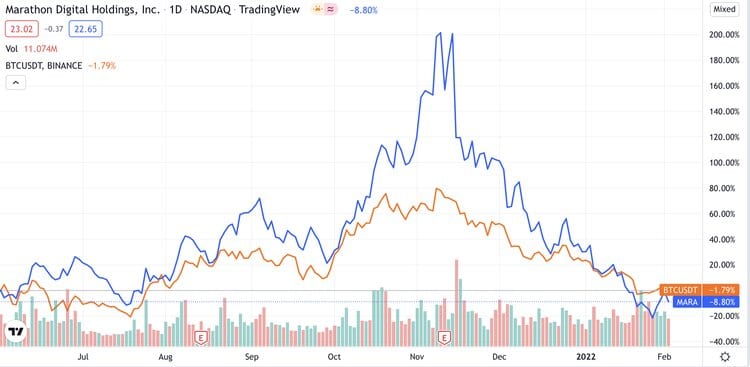 As you can see the correlation between Bitcoin and MARA is extremely. However, MARA tends to move even stronger than BTC meaning it should do better in uptrends. Image via TradingView I don't believe it comes as a surprise to anyone, but there are many risk factors for Bitcoin miners. The first is obviously the price of Bitcoin, which I already pointed out. The second, and equally as important, is environmental concerns. Marathon is based in the USA. If Bitcoin mining were to be banned due to environmental concerns, it would be catastrophic. However, what's more likely than that is regulations around the use of fossil fuels. According to Marathons latest report, they should be carbon neutral by the end of 2022, which is excellent, but any sudden changes to regulation could mean delays. The third risk is regulation in general. Now we've all heard of the weird legislation going into effect in the US, which would potentially classify miners as brokers and require them to collect KYC from all the transactions, which is impossible. Naturally, legislation like this causes threats to miners, and you need to consider them when analyzing a company.