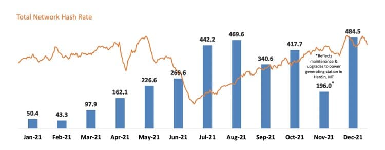 Marathon Digital is the largest publicly traded miner by market cap. Of course, other miners are good too, and some might even be better. However, what makes Marathon Digital stand out from the crowd is its extremely aggressive growth. In 2021 they mined 3,197 BTC, an 846 % increase from the previous year. In December alone, they mined 484 BTC. If you're fast, you calculated that if they continue the December rate, they'll mine a total of 5,808 BTC in 2022. That would already be a significant increase from 2021, but Marathon has something else in mind. Their latest report highlighted that by mid-2022, their hash rate should grow to 13.3 EH/s, and by the end of 2022, it should be up to 23.3 EH/s. That's a tremendous increase considering that currently, they only have 3.5 EH/s deployed.