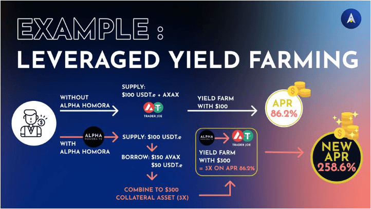 Alpha Homoroa V2 is a multi-chain lending platform and is DeFi's first leveraged yield farming protocol. Let's see what's the difference. Normal yield farming is where lenders deposit their funds into a DEX like Trader Joe's and earn trading fees. Lenders also get LP tokens which are then further staked to get more APR. In leveraged yield farming, lenders both lend and borrow funds to obtain 3x APR by yield farming with the combined value. This leads to a much higher APR.