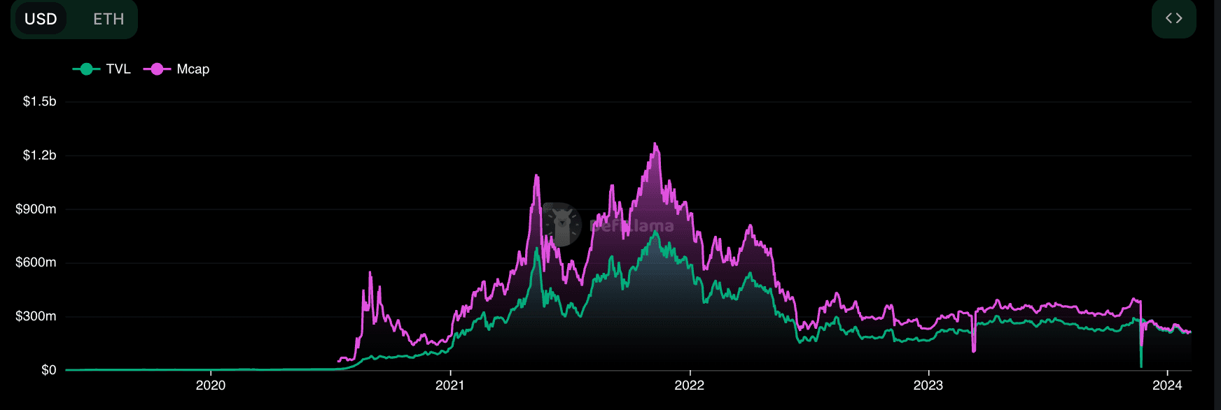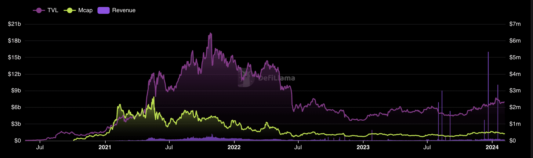 Aave is one of the earliest DeFi projects on Ethereum back in 2020 when DeFi was just coming into being. The open-source, non-custodial protocol allows lenders to earn interest through deposits and borrowers to borrow assets. As one of the first movers in the space, it is now firmly in position as the third-largest dApp in Ethereum by TVL.