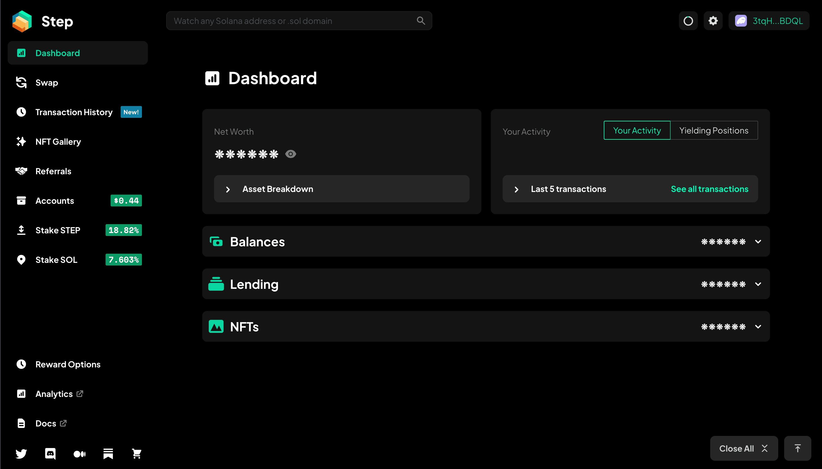 In addition, they've added a Transaction History section that provides more details than what the transaction history in the wallet offers so that you can do a more detailed investigation of each transaction. The dashboard comes with the ability to view or hide all balances on the portfolio. You can also view any NFTs in the wallet via their NFT Gallery. Staking options are also available for both STEP and SOL tokens.
