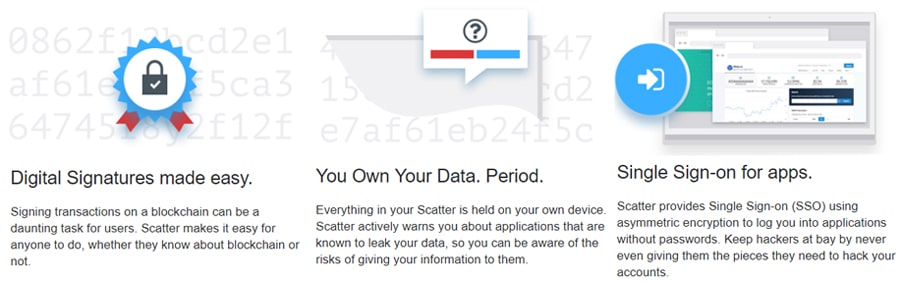 Main Advantages of Scatter. Source: Scatter WebsiteCurrently there is support for EOS and Ethereum, but more blockchains will be supported in the future. Tron was added recently, but currently only the Tron testnet is available. Scatter has plans to release a mobile version for iOS and Android.