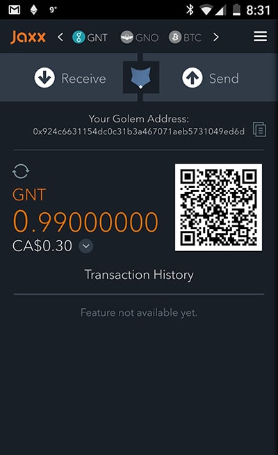 Jaxx Mobile Wallet Golem Integration. Source: RedditThe desktop version of Jaxx Liberty can be downloaded for Windows, OSX and Linux. The mobile version supports both Android and iOS devices, and there’s even a Google Chrome extension for using the wallet online. And you can synch and pair your wallet across all these devices. That’s convenience.