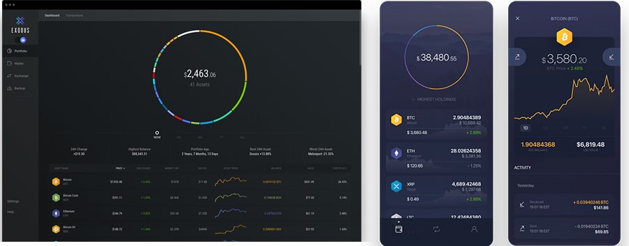 Exodus Desktop UI and Mobile Screenshots. Image via ExodusAnother really neat feature of the Exodus wallet is the in-built support for exchanging various cryptocurrencies. Hence, unlike other wallets you won't have to first send your crypto out - you can swap it right there on the wallet.
