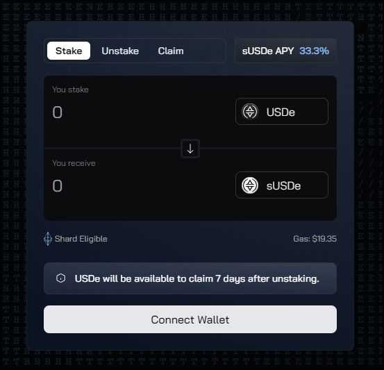 - Impressive Yields: A standout feature of USDe is its impressive yield offering of 33.3% APY on USD, a rate that's remarkably high compared to other stablecoins. This yield is driven by USDe's backing through Ethereum and ETH derivatives, capitalizing on the liquidity and market presence of one of the most traded and widely held assets in DeFi.
