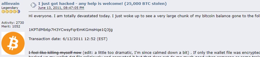 It isn’t just exchanges that have been the target of hackers. Allinvain is the pseudonym of a Bitcointalk forum user who posted in June 2011 of a hack that saw roughly 25,000 Bitcoin stolen from his computer. Allinvain had been an early Bitcoin miner, and had accumulated the 25,000 BTC through 2010 and early 2011. While he was able to identify the address where the BTC was transferred, he was never able to recover a single coin.