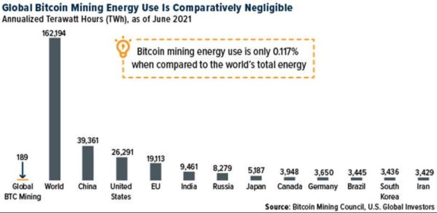 Bitcoin Mining Energy Consumption is Negligible Image via Forbes Of the 160,000 TWh of energy generated worldwide each year, 50,000 TWh is lost due to inefficiency, and electrical grids generate only 25,000 TWh. Bitcoin mining consumes around 120-190 TWh, a mere 0.1% of the total global energy production while utilizing 0.2-0.4% of the energy that would otherwise have been wasted. To put this into perspective, people playing video games uses more energy than Bitcoin mining, yet nobody is saying video games should be banned for that reason.