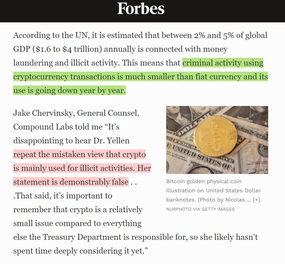 Time to Put This Tired Narrative to and End Image via Forbes To prove this point, a recent report from Chainalysis shows that criminal activity in 2019 only represented 2.1% of all crypto transactions, and in 2020 that figure dropped to 0.34%, so how are people paying criminal kingpins and their dealers? Good old-fashioned cash in hand just as it has always been. Can we please put this ridiculous argument to bed?