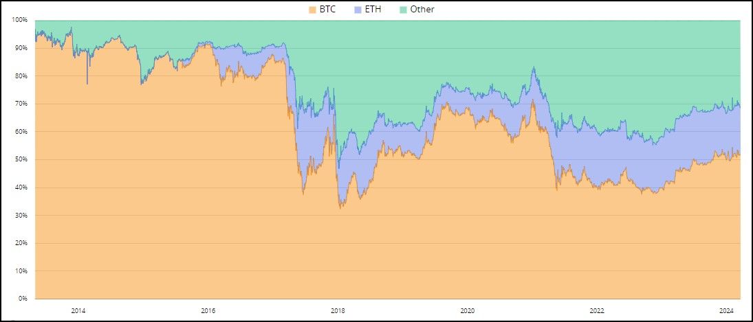 BTC and ETH Make Up Almost 70% of Web3 in 2024. Image via btctoolsRecent technological advancements and shifts in investor sentiment have significantly altered how we view and use these assets. Bitcoin is no longer just a digital gold; it's making inroads into DeFi, demonstrating its versatility beyond a mere store of value. Concurrently, Ethereum is witnessing a transformation, with its native token, Ether, increasingly being viewed as a potential store of value, a shift driven by its growing commodification and integral role in the crypto ecosystem.