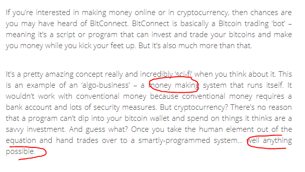 Regarding that last point, BitConnect promises lenders .25% daily returns if you invest over $10k, which would come out to 91% yearly returns—seemingly impossible.