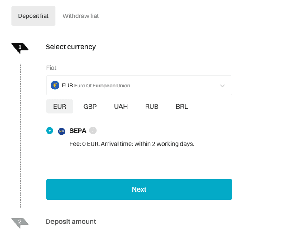 You can deposit fiat directly to your account using SEPA. The following fiat currency options are available for deposit.