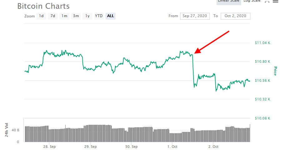 Crypto prices took a hit today as a double whammy of bad news unsettled the markets. First it was revealed that US president Donald Trump had tested positive for COVID-19, along with his wife, Melania.