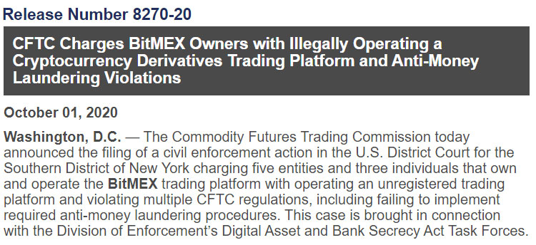CFTC Press Release Charging BitMEX BitMEX failed to put any of these in place, all the while actively courting US customers in defiance of the CFTC. The CFTC states that: