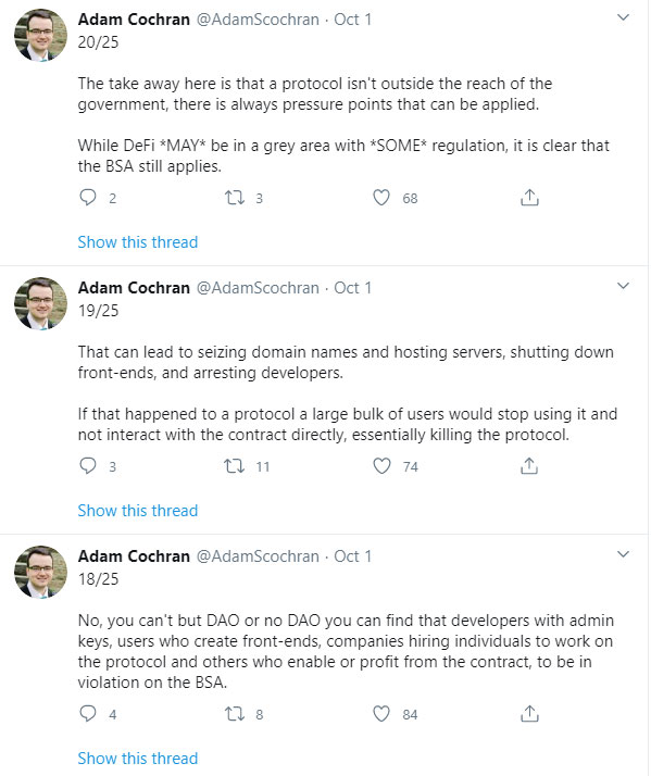 In a series of Twitter posts crypto and DeFi expert Adam Cochran has outlined the threat posed to DeFi by the actions of the CFTC and the DoJ. The point he makes is that DeFi is perhaps not as insulated against the attention of regulators as it might like to think.