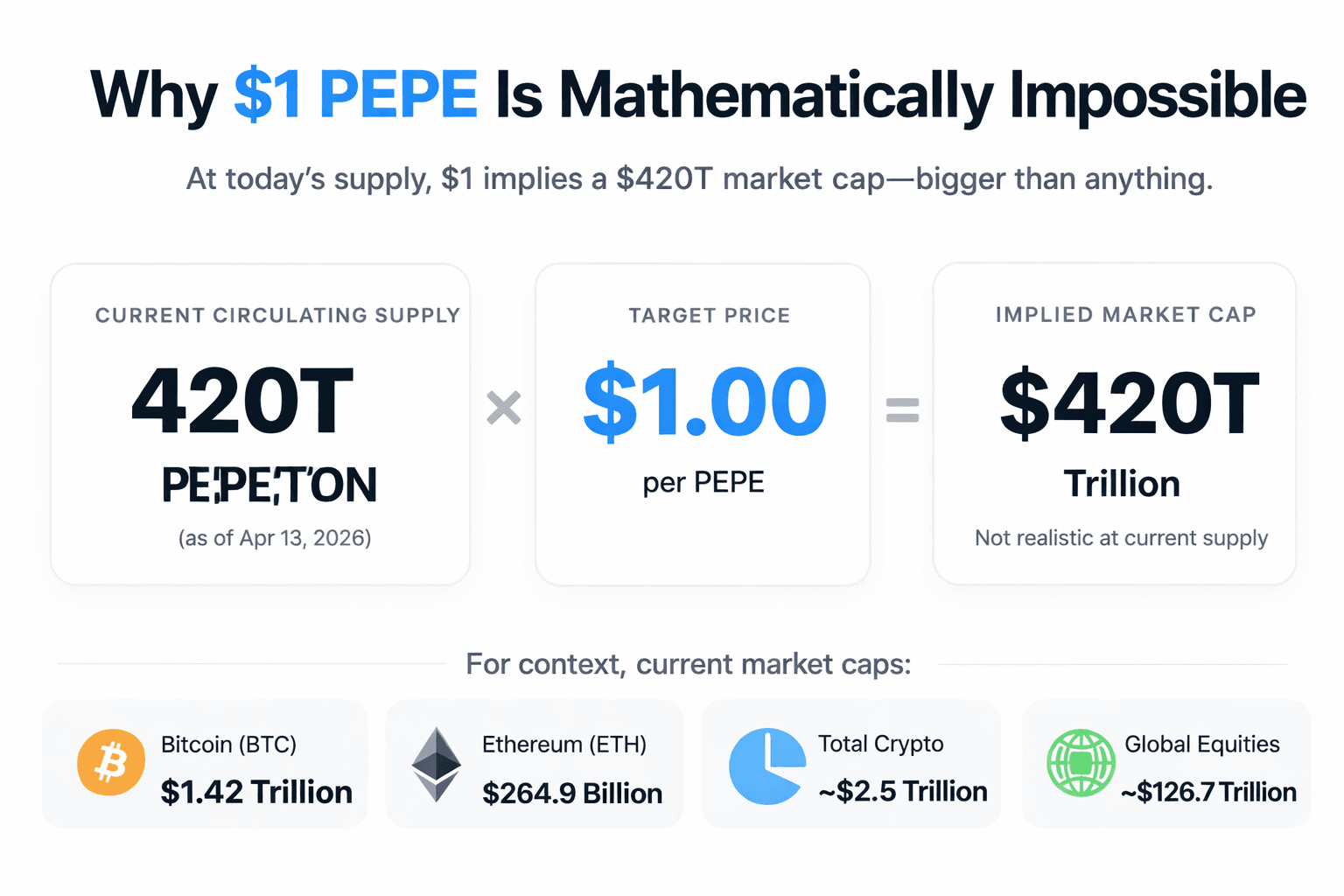 If the price reached $1, its market cap would explode to roughly $420 trillion, assuming the current tradable supply base of about 420 trillion PEPE. That would make it worth far more than Bitcoin and more than 3x the size of the global equity market, which SIFMA estimated at about $126.7 trillion.