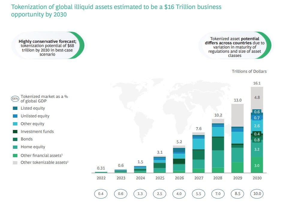 Tokenization of Illiquid Assets Is Estimated to Be a $16 Trillion Business Opportunity by 2030. Image via Boston Consulting GroupKeller envisions a powerful role for tokenization in reshaping finance over the next decade. By 2030, tokenizing traditionally illiquid assets could develop into a $16 trillion industry, particularly through applications like securitized mortgages and asset-backed securities. Tokenization offers “immense potential across finance,” he explained, enabling a shift from illiquid to liquid assets, which could bring new efficiencies and accessibility to the financial sector. He also sees tokenization as especially promising for the metaverse and for digital ticketing, areas where it could "revolutionize asset ownership and accessibility."
