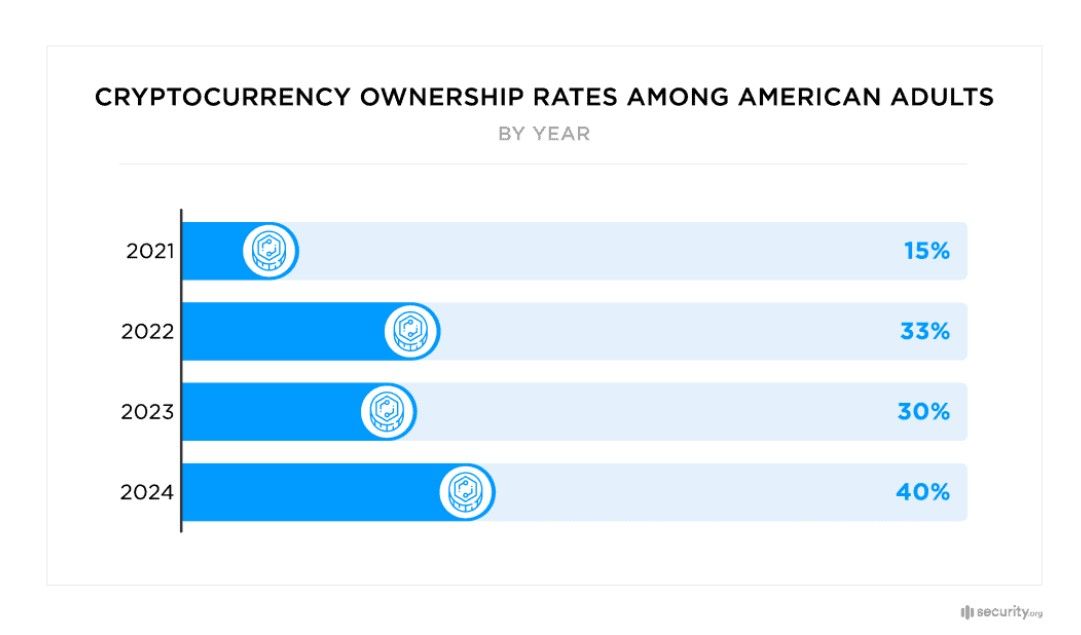 A Survey Revealed Significant Growth in Cryptocurrency Ownership and Enthusiasm in the US. Image via Security.orgWomen's crypto ownership notably surged from 18% to 29%, attributed to prominent figures like crypto journalist Laura Shin and Ark Invest CEO Cathie Wood, who advocate for blockchain investment.