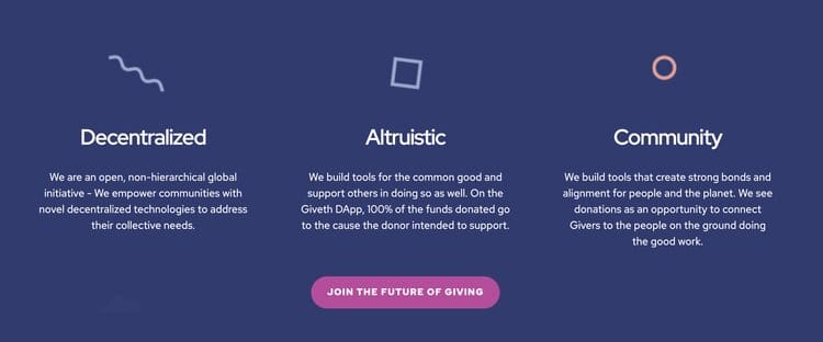 Here's what Giveth is. Image via Giveth. The second great feature I wanted to point out is about Giveth’s structure. Giveth is open-source and governed by a DAO and the GIV token holders. You receive GIV tokens when donating, which means you become part of the community and can stake your tokens in order to receive additional rewards. However, for a project like this I don’t see earning rewards as the main driver. Rather you get to participate on the ground level in a growing philanthropy project. Giveth has an active discord group and they urge people to join and discuss ideas.