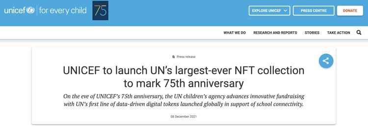 There's still some left if you want to get your hands on a cool looking beluga whale. Image via Belugies What’s great to see is that traditional organizations have noticed the NFT sector. Recently Unicef announced that they’ll be minting 1000 NFTs to celebrate their 75th anniversary. I think this is great. It’s understandable to think that if you purchase these NFTs you won’t make any money, but when it comes to charity NFTs that’s not the point. For you as a donator I would look at it more as a proof-of-donation and a memory of doing something good. Not every NFT has to be an investment.