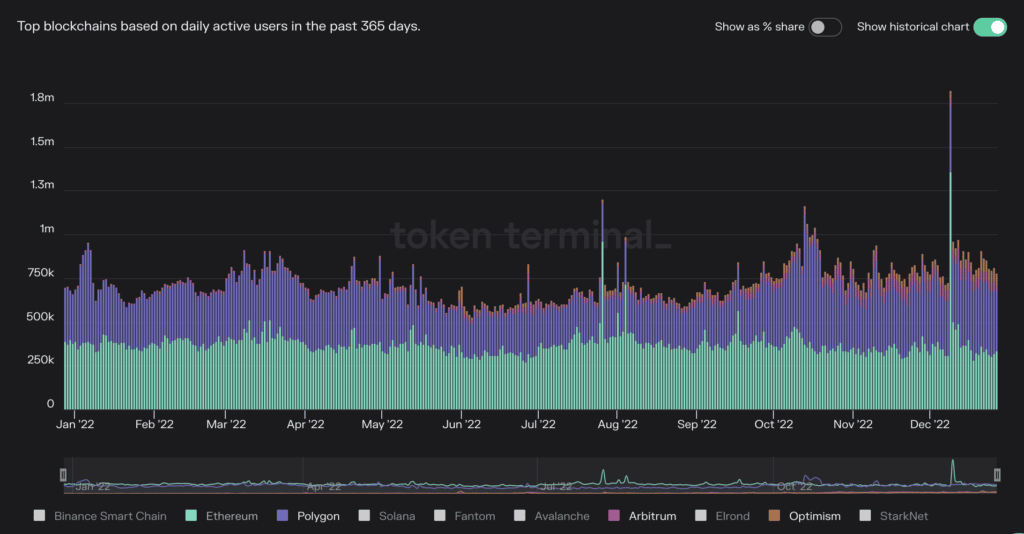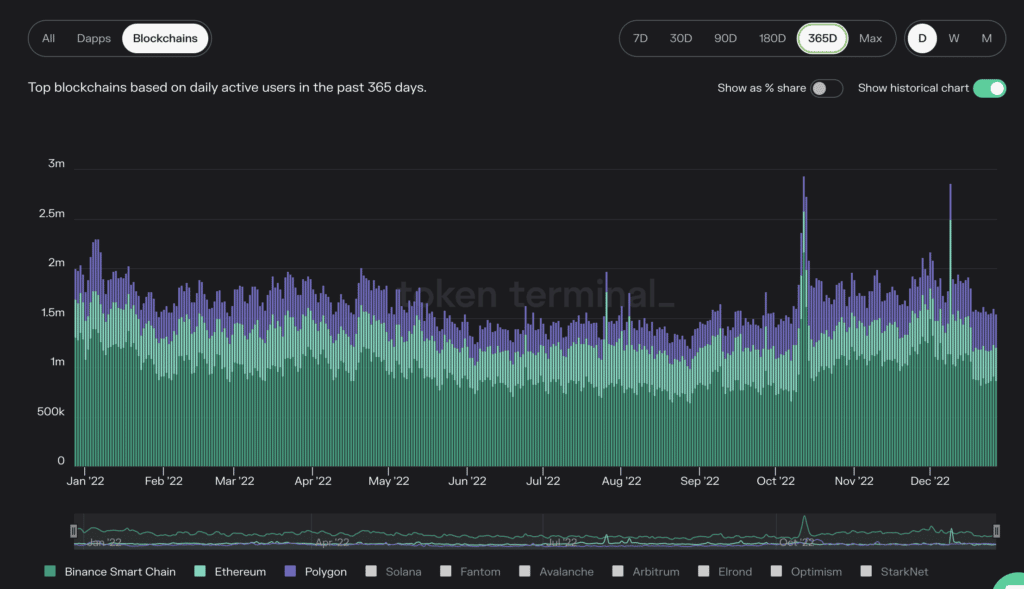 The Binance chain is enormous, just take a look at the following graph showing that over the past 365 days, the Binance Chain has had more active users than either Ethereum or Polygon.