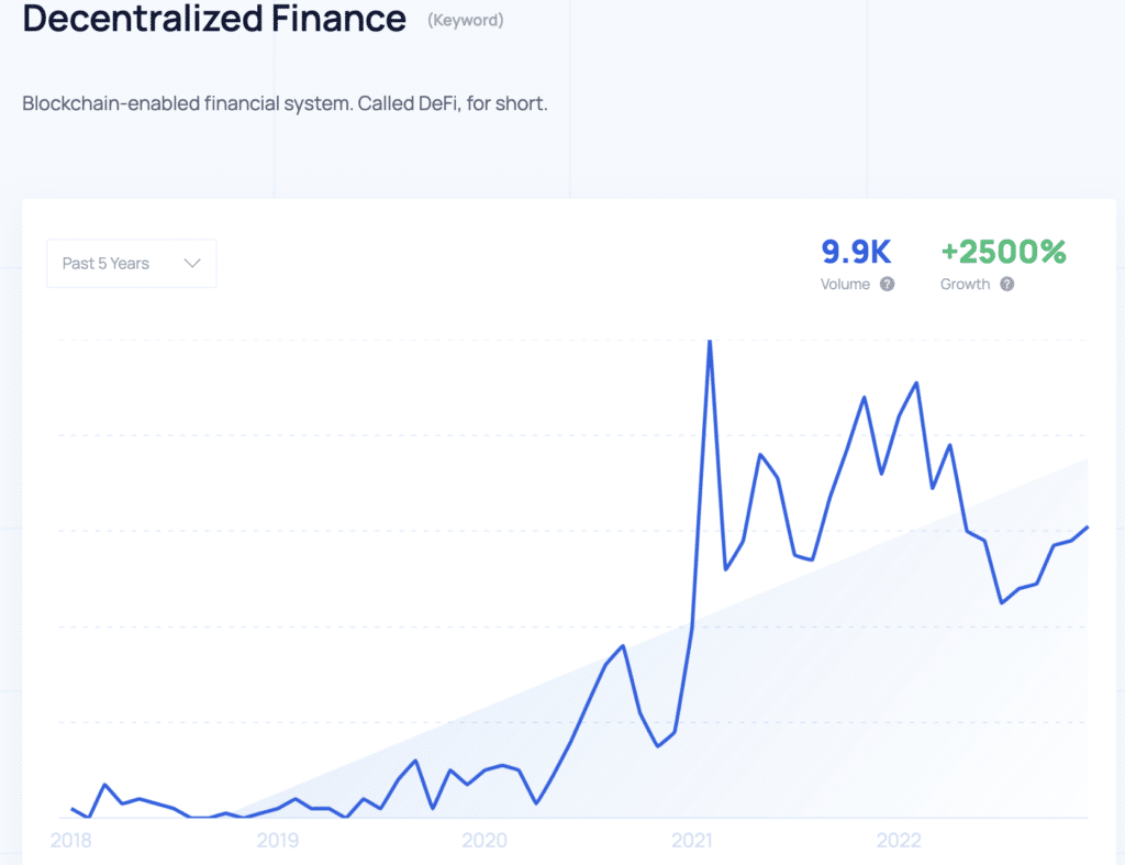 Value Locked in DeFi Protocols has Been On an Astronomical Rise. Image via DeFi LlamaAnd taking a look at Google search trends for “DeFi”, we can see a clear upward trajectory over the past five years as crypto adoption grows and more people seek to understand it.