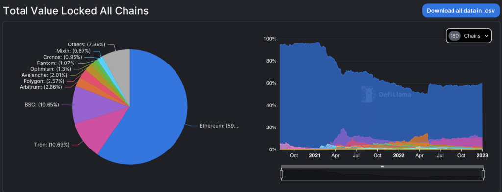 Ethereum benefits from first mover advantage by a large timeframe spanning over 5 years of true value capture and supports the largest ecosystem in crypto. At the time of writing, Ethereum makes up about 60% of the entire value locked in crypto (excluding Bitcoin), with the next largest, Tron, coming in at a mere 10%