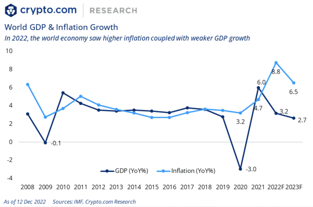 Here’s a snapshot from Crypto.com Research showing how global inflation outpaced global GDP growth, always a recipe for poor asset performance.